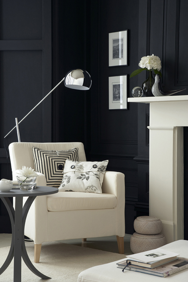 BLACK. The contrast with the black and white in this photo is stunning. Black is associated with dignity and sophistication. Notice that most professionals where black–the fact that is slims the body is only one reason. =) There is mystery with black and in western cultures it is associated with death and negativity. For the home, black adds glamour and formality to a room. Black, like white, are classic colors that will always have a place in interiors.