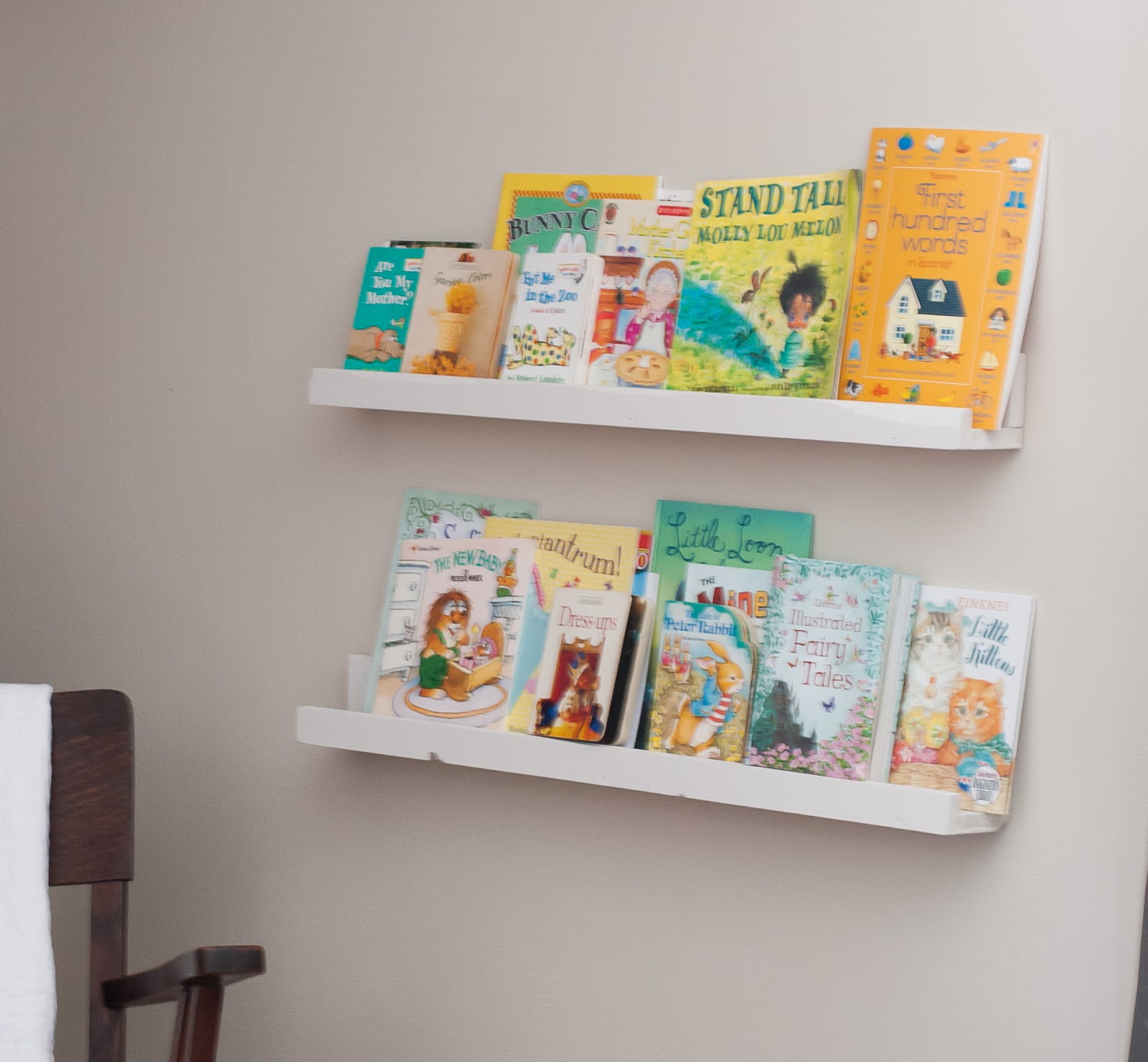| Cody built me some shelves for the living room for the kid books. We have kept the kid books in the basement and I wanted them more accessible. The girls read more now that they are upstairs and they can see the covers! |
