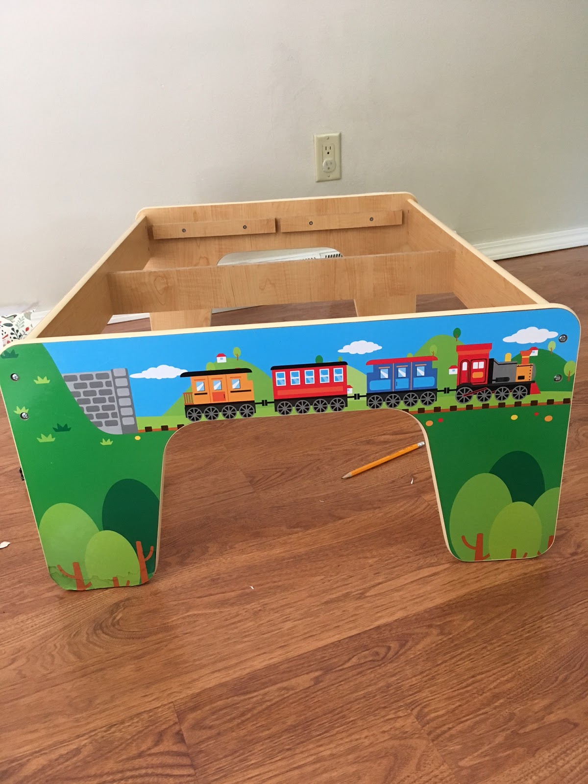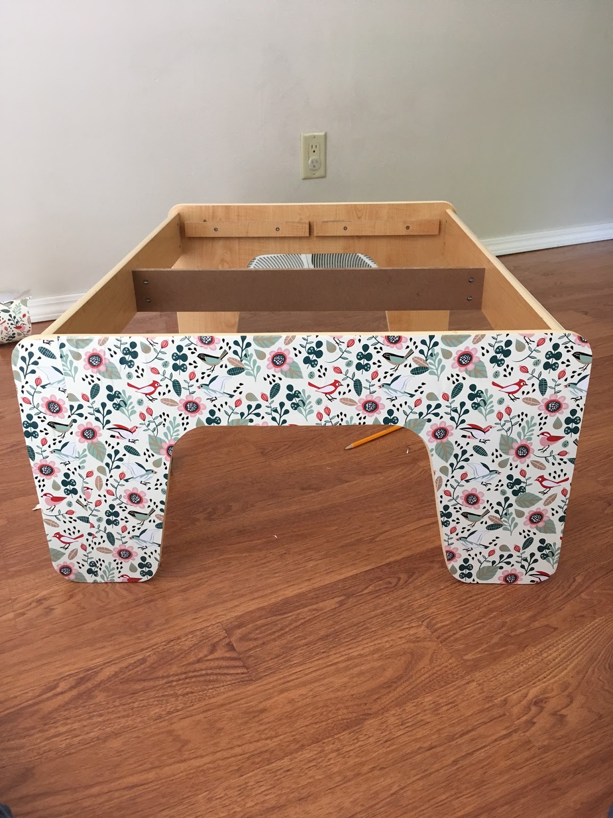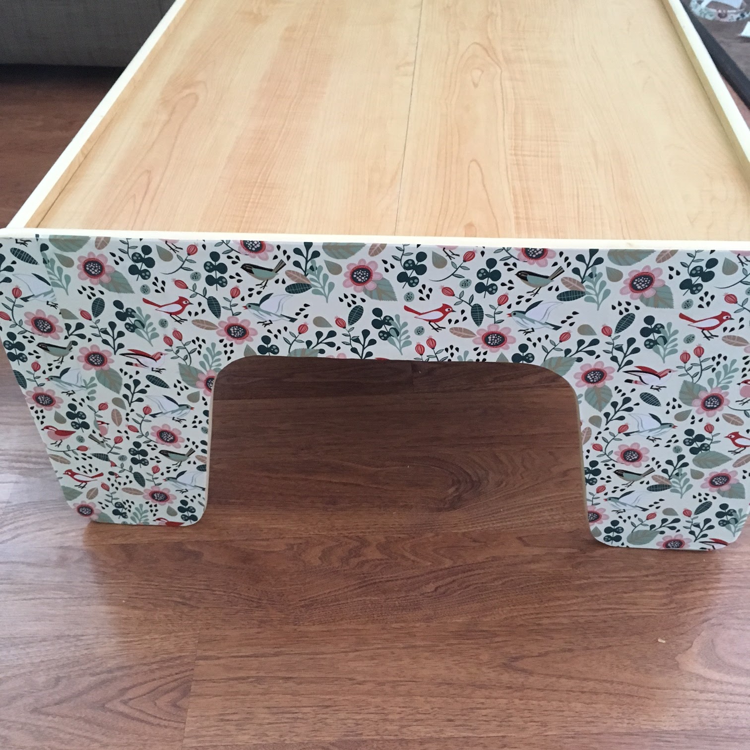 In the meantime, I did start another project I have been wanting to do. I saved a train table that we got the girls for Christmas one year because it is the perfect height for the little ones to play at. I do not like the train paper or the primary colors that are so common with kids stuff, so I covered it with a paper (from Joanns) that I like. I originally got the print thinking it was contact paper, but when I opened it I was disappointed. It is simply project paper and however pretty it is, I had to trace the table onto the paper, cut it and then Mod Podge it on. It is not perfect, but it is an improvement. I will be more willing to put the table out now.